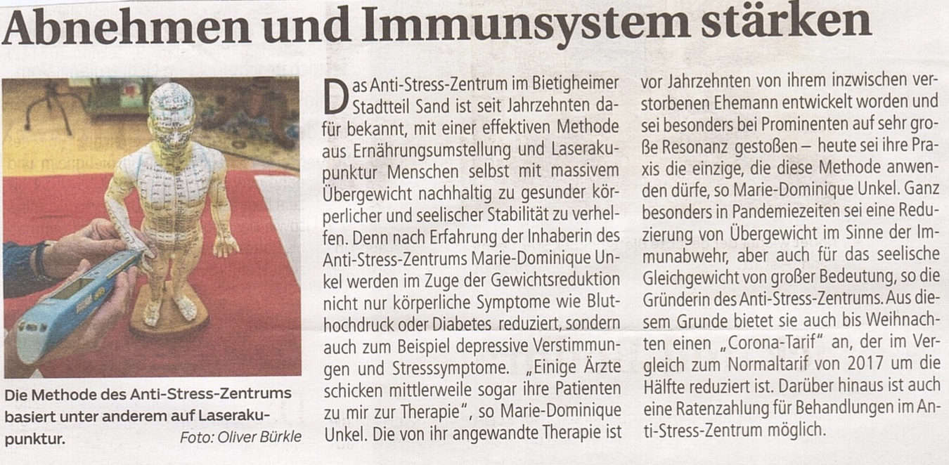 Die Bietigheimer Zeitung berichtet in ihrer Ausgabe vom 20.04.2018 über die Methode des Anti-Stress-Zentrum gegen Stress, Übergewicht und viele andere Symptome und Ursachen zivilisationsbedingter Krankheiten.